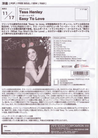 国内デビューが決まったTess Henleyのボートラはなんと<風シル>♪ 2008年製作のデビューアルバム『Easy To Love』が紙ジャケ仕様+2曲のボートラを追加して11月17日、VIVID SOUNDから発売されます。 発売の一足先にVIVID様よりCD-Rとフライヤーを頂戴しました。 彼女はメジャーからも声がかかるくらいの器、スマッシュヒットしたタイトル曲<Easy To Love>はかなり心地よいグルーブ。 <風シル>はMycle Wastmaとのデュエットで、数あるカバーの中でも上位に入る仕上がり、これな感じで本家ボビーがジーンとのデュエット聴かせてくれないかな?