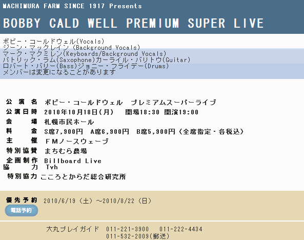 昨年に続き今年も札幌公演が決まったようです。 今回は札幌市民ホールに会場を移しての開催、キャパは1500、昨年の倍。 17日に移動して、18日リハ→本番でしょうね? 前回は大阪から朝飛んで、直接会場入り、リハ後本番。 翌日朝一で成田と云うトンでもないスケジュールにメンバーかなり疲れでした。 それに比べるとちょっと余裕ですね。 それにしても月曜日って、、、行きたいけどちょっと無理そう(泣) ![]() [14/Jul/2010] |